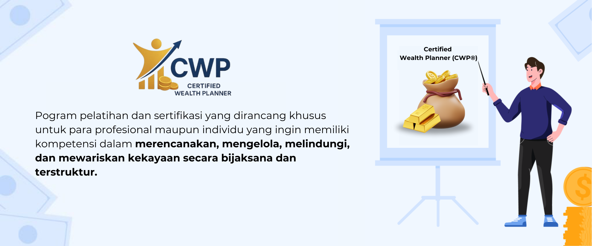 Program Certified Wealth Planner (CWP®) dirancang untuk kamu yang ingin membawa peran finansial ke tingkat yang lebih berdampak.